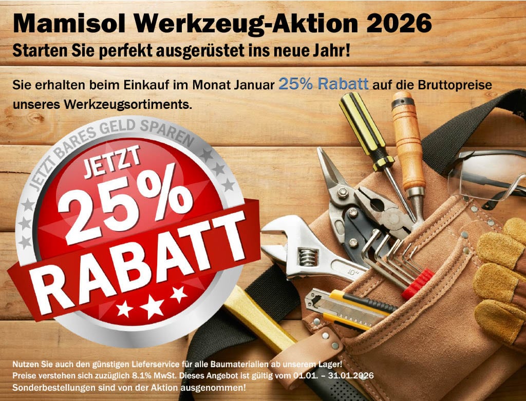Starten Sie perfekt ausgerüstet ins neue Jahr! Sie erhalten beim Einkauf im Monat Januar 25% Rabatt auf die Bruttopreise unseres Werkzeugsortiments. Preise verstehen sich zuzüglich 8.1% MwSt. Dieses Angebot ist gültig vom 01.01. – 31.01.2026. Sonderbestellungen sind von der Aktion ausgenommen!